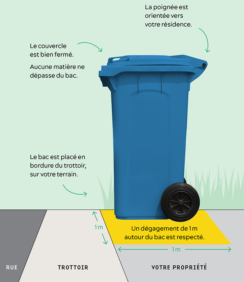 Vous devez placer votre bac en bordure du trottoir les roues et les poignées orientées vers votre résidence. Son couvercle doit être bien fermé et rien ne doit être déposé par-dessus ou à côté de celui-ci. Vous devez laisser un dégagement de 1 m (3 pi) tout autour du bac.